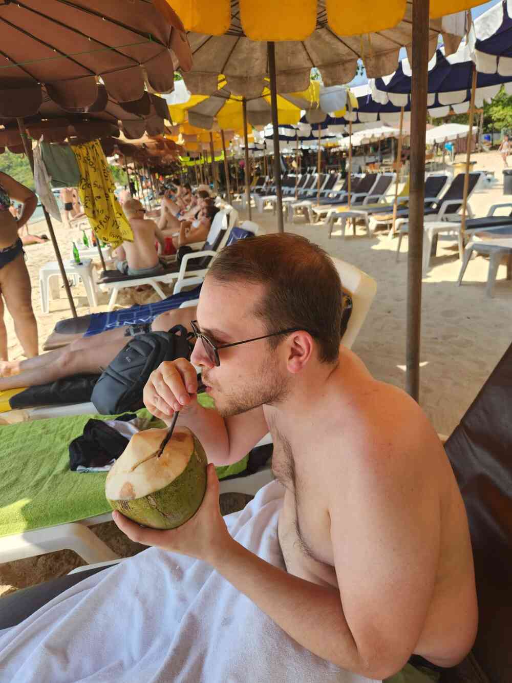 minuten stonden er een paar kokosnoten op onze tafel, en opnieuw heel