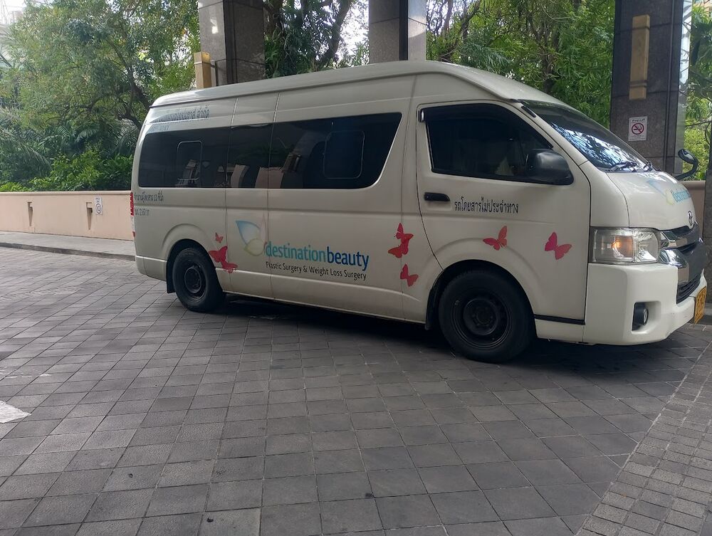 kleine bestelwagen, gelukkig met airco, waar een man of tien ingepropt werd om de tocht zo rendabel