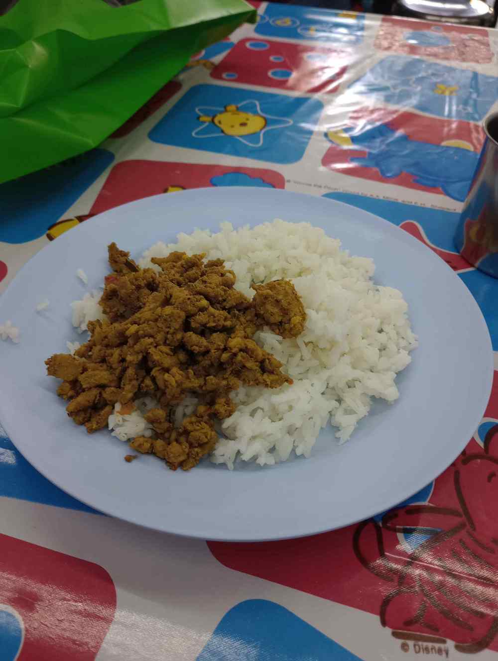 een soort kantine een bord rijst met varkensvlees te eten voor de
